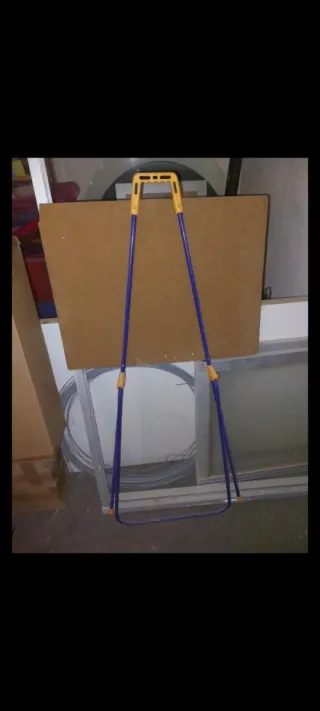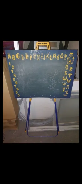Pizarra con soporte. - Diseñada para niños, con abecedario y números. - Marco azul con dibujos de animales. - Soporte plegable para fácil almacenamiento.