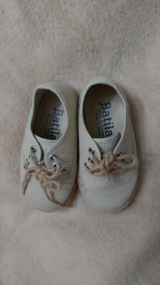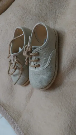 Preciosos zapatos para bebé o niño pequeño. - Color beige o crudo. - Cierre con cordones. - Detalle de esparto en la suela.