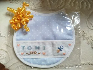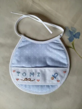 Precioso babero para bebé con detalles de encaje. - Diseño delicado con motivos. - Borde de encaje. - Falta blanqueado y planchado.
