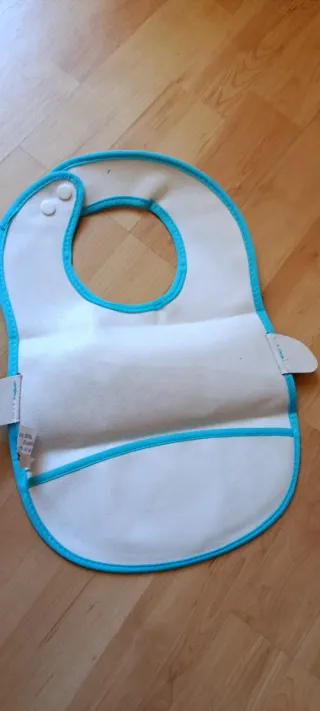 Más cosas en mi perfil !! Babero impermeable de color crema, ideal para proteger la ropa durante las comidas. - Material impermeable - Bolsillo recogemigas. - Cierre de botón