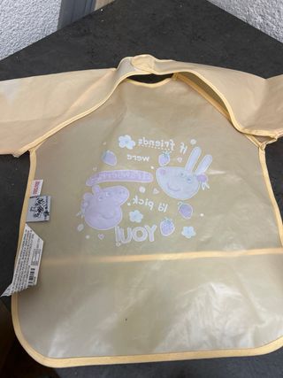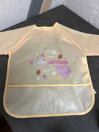Práctico babero con mangas largas, ideal para proteger la ropa de los más pequeños durante las comidas o actividades. - Diseño divertido con personajes de Peppa Pig. - Mangas con puños elásticos. - Borde de color verde. - Estampado de árboles, nubes y erizos.