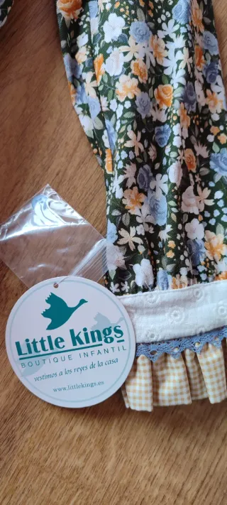 Vestido infantil con estampado floral y babero. - Tejido principal con estampado de flores en tonos verdes, naranjas y azules. - Babero blanco con detalles de encaje y puntilla. - Volantes en el cuello y mangas con estampado de cuadros. - Ribete azul en el borde del babero.