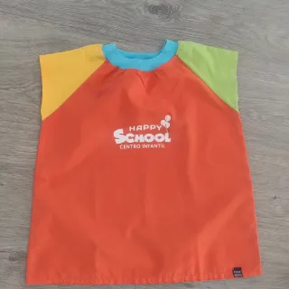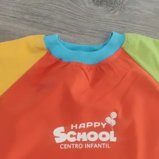 Babero de guardería con el logo de Happy School. - Diseño con mangas cortas. - Cuello redondo. - Colores: naranja, amarillo, verde y azul.