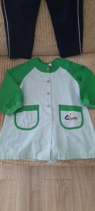 Uniforme escolar de la Sagrada Familia en talla 4. Babero de manga larga con botones. Talla amplia Con defectos pero todavía le puedes dar uso - Color principal: verdel claro con rayas finas blancas. Pantalón de psico azul marino , con marcas en las rodillas. De ahi su precio.