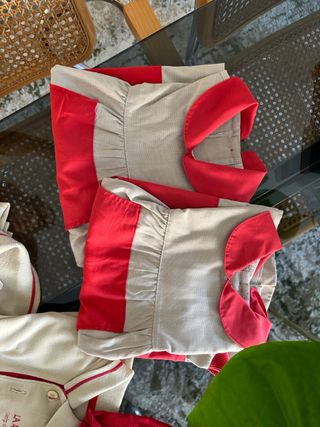 Conjunto de uniformes escolares de La Aurora talla 2. Incluye varias prendas de vestir. - 4 camisetas de manga corta en color beige con detalles rojos. - 3 camisetas manga marga - 2 Pantalones cortos y 1 largos . - 3 pichis - 2 baberos - Una mochila escolar
