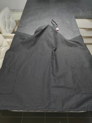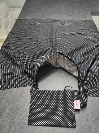 Pañuelo de lactancia materna negro con puntos blancos, ideal para que el bebé no se distraiga durante la lactancia. Dispone de bolsillos para guardar objetos como baberos o toallitas Viene con su bolsa para guardarlo que hace juego