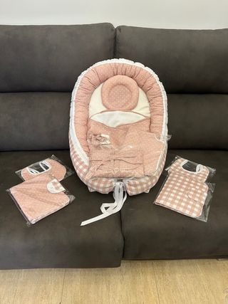 Conjunto para bebé. Hecho a mano. Ideal para regalo. Elige tu diseño para combinarlo con la habitación. Puedes cambiar, quitar o añadir complementos a tu gusto. Pregunta sin compromiso. Compuesto por: - Nido para recién nacido con cojín. - Mantita de invierno. - 4 Baberos. - 2 Toallas de lactancia. - Porta documentos - Porta toallitas y pañales - Chupetero - Cambiador de bolso. - Pedido bajo encargo. Tiempo de realización 20 días. - Envío en 24/48 horas 📦
