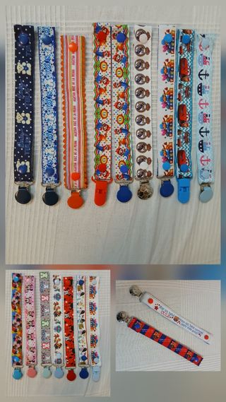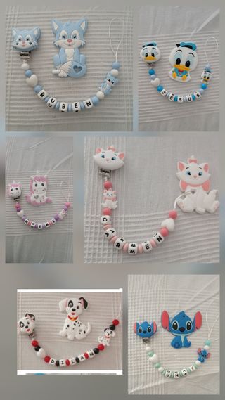 Chupeteros personalizados de silicona y cinta, ideales para colgar el chupete o el mordedor. - Diseños variados con personajes infantiles. - Piezas fabricadas con 100% silicona alimentaria, libre de BPA y otros agdntes nocivos, ideal para aliviar los molestos dolores de dentición, fácildelimpiarcon agua y jabón. - Posibilidad de incluir el nombre del bebé. - Opciones para añadir baberos, diademas y llaveros a conjunto con fl chupetero.