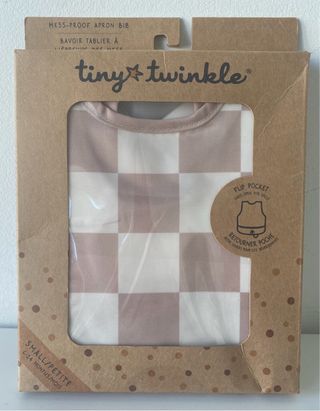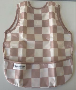Babero tipo delantal de la marca Tiny Twinkle, diseñado para ser a prueba de derrames. - Estampado de cuadros en tonos beige y blanco. - Talla Small/Petite (6-24 meses). - Cuenta con un bolsillo frontal que se abre para recoger alimentos. - Cierre ajustable en el cuello.