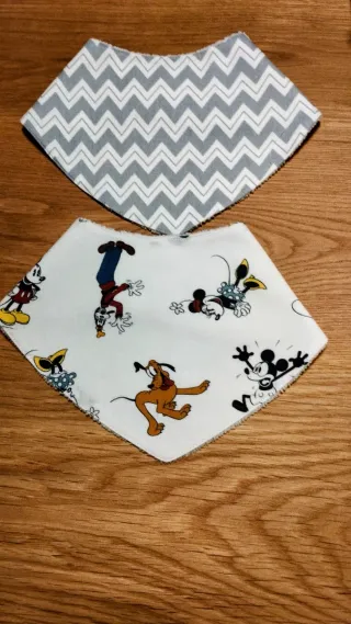 Conjunto de dos baberos para bebé con divertidos diseños de Disney. Tengo más telas para hacerlas personalizadas. Las hago por encargo. _6€" CADA UNA" - Un babero con estampado de zig-zag en gris y blanco. - Otro babero con personajes de Disney como Mickey Mouse, Minnie Mouse y Pluto.