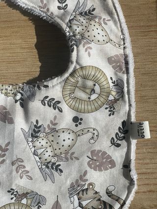 Babero artesanal con un adorable estampado de animales de la selva, perfecto para los más pequeños en la fase de dentición - Diseño con leones, tigres y leopardos. - Tonos neutros y suaves. - Cierre de botón a presión. - babyOLLIE - Algodón y rizo de bambú Instagram: @mibabyollie