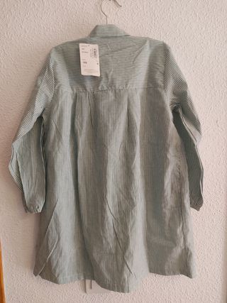 Babero colegio rayas verdes Talla 6 Largo: 70 cm Ancho pecho: 48 cm Elástico en los puños Cuello camisero Marca Alber S.L 50% poliéster 50% algodón Nuevo a estrenar