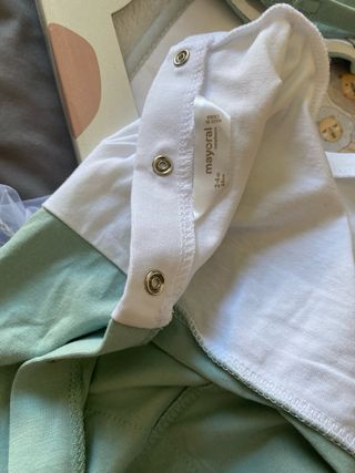 Conjunto bebe mayoral de color verde agua, compuesto por un mono, un gorro y una toalla con babero a juego. Incluye también una bolsa con 3 gasas de tela. El conjunto está en perfecto estado. -Toalla, babero y gasas a estrenar. -Conjunto mayoral 2-4 meses. Muy poco uso.
