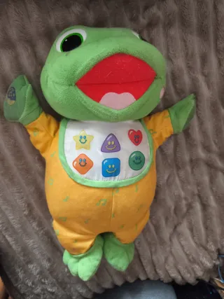 Juguete interactivo de rana cantarina de LeapFrog. Ideal para el aprendizaje temprano. - Diseño de rana verde con ropa amarilla. - Babero con formas de colores y caras. - Tejido suave y apto para niños.