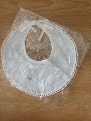 Precioso babero para recién nacido, ideal para ocasiones especiales. - Diseño blanco con delicado bordado floral. - Borde festoneado. - Cierre con lazo de tela.