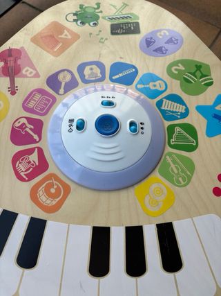 Mesa de actividades musicales de madera de la marca Baby Einstein y Hape. Ideal para que los más pequeños exploren sonidos e instrumentos. - Diseño triangular con patas. - Teclado de piano en la parte frontal. - Centro interactivo con botones y luces. - Ilustraciones de instrumentos musicales y animales.