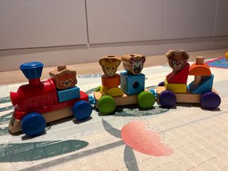 Tren de arrastre de madera con vagones y figuras de animales. - Locomotora roja. - Vagones con bloques de colores. - Figuras de animales en la parte superior. Esta como nuevo apenas usado.