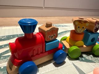 Juguete de tren de madera con bloques de animales de la marca Baby Einstein Hape. Ideal para el desarrollo de la motricidad fina y la imaginación. Muy poco usado y bien cuidado. Tiene todas las piezas y la chimenea azul del tren hace el leve pitido cuando se aprieta. - Tren de madera con 2 vagones. - Bloques con diseños de cabeza de animales y formas geométricas. - Colores vivos y atractivos. Juguete de arrastre de madera y plástico, de colores, con forma de gusanitos con gafas y con cuerda de arrastre roja. Muy poco usado y muy bien cuidado. Está como nuevo. Niño Niña Bebé