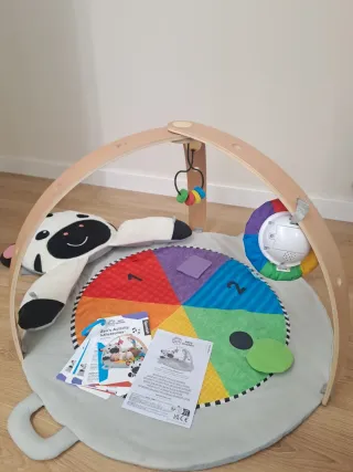 Gimnasio para bebés de la marca Baby Einstein, con un diseño colorido y educativo. - Incluye arco de madera con juguetes colgantes. - Tapete de actividades con diferentes texturas y números. - Peluche de vaca. - Juguete musical. - Manuales de instrucciones. Incluye también almohada oficial.