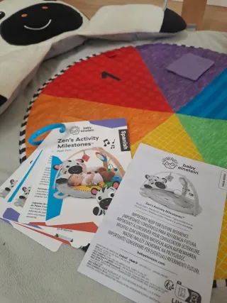 Manta de actividades con diseño de cebra de la marca Baby Einstein. Ideal para el entretenimiento y desarrollo del bebé. - Incluye un divertido arco de juegos de madera. - Diseñada con colores vivos y texturas variadas. - Cuenta con diferentes elementos para estimular los sentidos del bebé. Tiene voz,la bola enseña colores en español y en ingles,y tiene melodias. Comprada en El Corte Inglés,sin apenas uso.