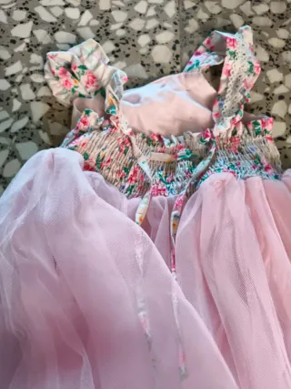Vestido de fiesta para niña con un bonito estampado floral en la parte superior y una falda vaporosa de tul rosa. - Diseño con tirantes. - Detalle de volantes en las mangas. - Bonito fruncido en la espalda. - Falda de tul muy amplia y cómoda con forro. Talla 5 años. Puesto una única vez. Ideal para las niñas en eventos tipo comuniones y bodas.