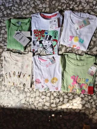 Lote de seis camisetas de manga corta para niña de 6-7 años con diferentes estampados. Todas a estrenar y aún con su etiqueta. Ideal para verano.