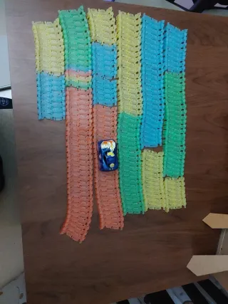 Conjunto de piezas para construir una pista de coches. - Piezas de colores: naranja, azul, verde y amarillo. - Compatible con coches de juguete. - Ideal para crear circuitos personalizados.
