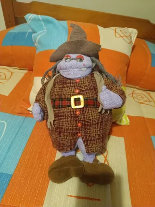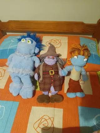 Tres peluches de los Lunnis, personajes de la televisión infantil. Se pueden vender por separado 5€ cada uno - Peluche azul con pelo azul y detalles blancos. - Peluche morado con sombrero de bruja y traje a cuadros. - Peluche azul con pelo naranja y falda marrón.