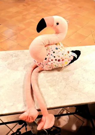 Flamenco rosa gigante de gran tamaño (119 cm de alto), nuevo a estrenar y con etiqueta original. Nunca usado, únicamente expuesto en interior. Es una pieza muy llamativa y elegante, ideal como elemento decorativo para dormitorio, salón, escaparate, estudio o habitación infantil. Su diseño en tonos rosa suave con detalles de círculos multicolor brillantes le da un estilo moderno y exclusivo. Tejido muy suave y de gran calidad, con excelente presencia visual. Perfecto también como regalo original o para crear ambientes acogedores y con personalidad. Características: • Altura: 119 cm • Estado: nuevo con etiqueta • Marca: BMA Toys