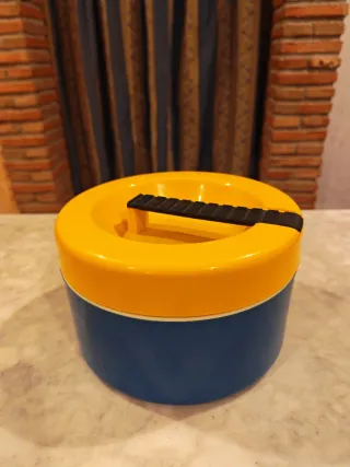 Fiambrera vintage original de plástico con diseño retro en amarillo mostaza y azul petróleo, con asa negra. Ideal como pieza decorativa, almacenaje o colección de objetos vintage. Estética muy característica de los años 70-80. No cierra herméticamente, por lo que se vende como objeto decorativo o de almacenaje. Buen estado general. Entrega en mano en Albacete o envío.