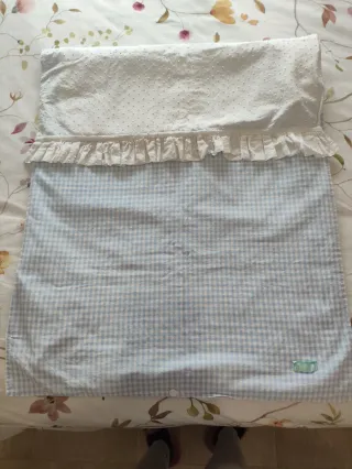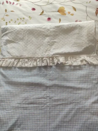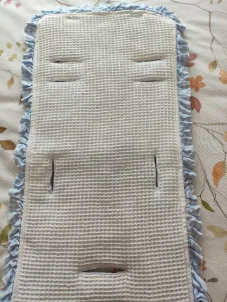 Preciosa colchoneta universal, es reversible, un lado tiene tela wafle blanco con volante en Vichy celeste y el otro lado todo en Vichy celeste como se aprecian en las fotos está como nueva poco uso. Precio original 80€.