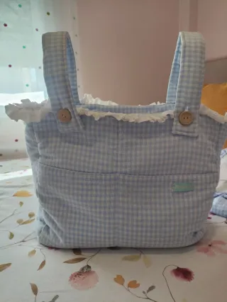 Se vende precioso bolso de gran capacidad para carro de bebe. Diseñado en tela de Vichy celeste y volante de plumeti, tiene bolsillos exteriores e interiores, tela forrada interior impermeable, está como nuevo. Precio original 80€. Tengo cambiador a juego, se venden por separado, si se compran juntos hago precio, se puede apreciar en la última foto.