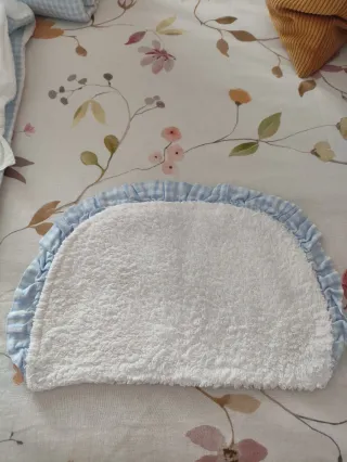 Preciosa salvababas, de tejido en bambula blanca combinada con volante en Vichy celeste, forrada por detrás como se aprecia en foto en tela de toalla para que no empape. Ideal para ponerla en el capazo del bebe o en la cuna, Está impecable de nueva.