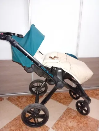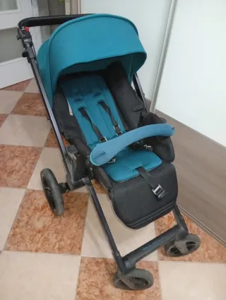 Cochecito de la marca Jane en color azul turquesa y negro. Es un modelo ligero y fácil de maniobrar. - Capota extensible. - Arnés de seguridad de 5 puntos. - Barra delantera. - Ruedas todoterreno. - incluidos los accesorios ( maxicoxi,carricoche, y silla de paseo )