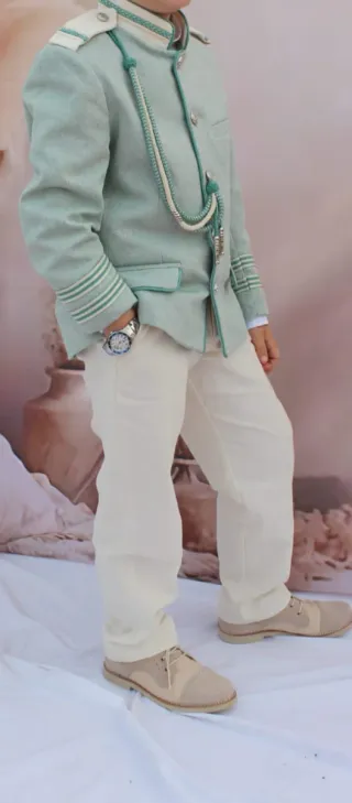Conjunto de traje de comunión para niño, elegante y moderno. - Chaqueta de color verde menta con detalles en blanco y verde. - Pantalón de color beige. - Cordón decorativo en el pecho. -traje de nueva temporada marca la hormiga