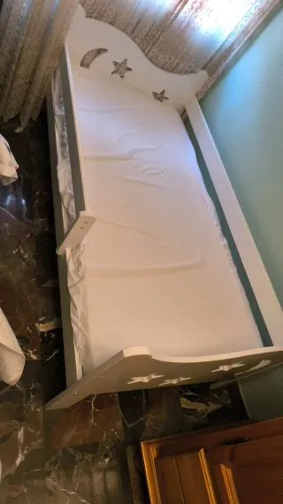 Cama infantil de color blanco, con un diseño encantador. - Detalles de estrellas y luna. - Estructura de madera. - Barreras de seguridad - colchón incluido - solo se a usado dos veces está nueva