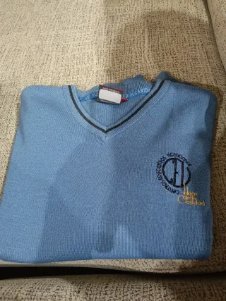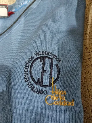 Jersey de punto azul con el escudo de Hijas de la Caridad.talla 12. - Escudo bordado con Centros Educativos Vicencianos y Hijas de la Caridad. - Cuello en V.