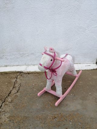 Adorable caballo balancín de peluche, perfecto para los más pequeños. Su diseño en color rosa con detalles blancos lo hace muy llamativo. - Peluche suave y tierno. - Base balancín de madera. - Adornado con lunares blancos.
