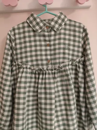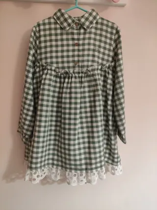 Vestido de niña con estampado de cuadros Vichy en color verde y blanco. Presenta un diseño con cuello camisero. - Cuadros Vichy verde y blanco. - Cuello camisero. - Volantes en la cintura. - Detalle de encaje en el bajo. Solo tiene una puesta. Precio original 65€.