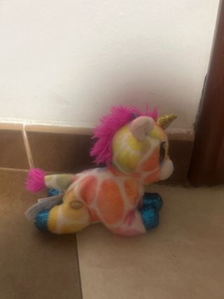 Adorable unicornio de peluche con un diseño vibrante y colorido. - Cuerpo blanco con manchas de colores (naranja, amarillo, rosa, verde). - Crin y cola de color rosa fucsia. - Cuerno dorado brillante. - Patas delanteras y traseras con detalles brillantes en azul.