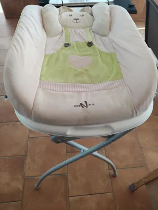 Bañera y cambiador para bebé con un adorable diseño de oso, ideal para los más pequeños. Su estructura es plegable para facilitar su almacenamiento. - Cojín acolchado con estampado de rayas y corazón. - Detalle de tirantes y botones en el cojín. - Marca 'neoNato' visible en la base.