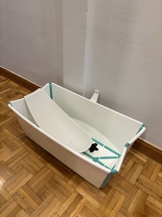 Bañera para bebé Stokke, en buen estado. Es plegable para facilitar su almacenamiento. - Marca: Stokke - Plegable - Color blanco - Tamaño grande Se regala otra mas pequeña, SIN TAPON Y CON UNA PEQUEÑA FISURA EN EL BORDE pero perfectamente funcional.