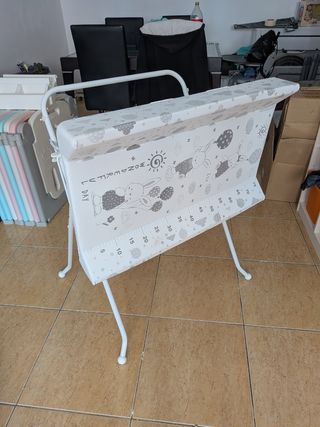 Bañera/Cambiador grande de bebé plegable, en buen estado. - Estructura blanca de metal. - Superficie acolchada con diseño de conejitos. - Incluye medidor de altura integrado, balda, cajones, tapón y tubo desagüe.