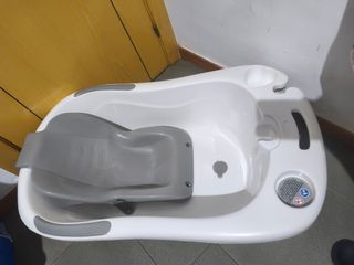 Vendo bañera de bebé con capacidad de almacenaje, ideal para que los más pequeños estén cómodos y seguros durante el baño junto con la almohadilla para que no se resvalen. incluye bañera para cuando sean un poco más grandes