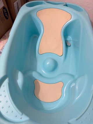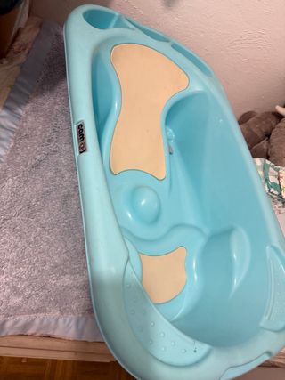 Bañera ergonómica para recién nacidos, diseñada para imitar la posición fetal. - Material translúcido. - Forma ovalada. - Borde curvo para un mejor agarre. Se vende porque mi bebe ya esta grande. Yo no conocía la bañera, me la recomendó la matrona, y tengo que decir que mi bebe siempre estuvo tan a gusto en los baños en esta bañera. Hay algo en la posición fetal que le relajaba e incluso aliviana los colicos.