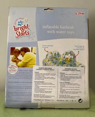 Bañera hinchable de la marca Nikidom , nueva estrenar , para bebés desde su nacimiento hasta los 24 meses , con arco y juegos para tener entretenido al bebé , fácil de hinchar y con ventosa para pegar al azulejo del baño .