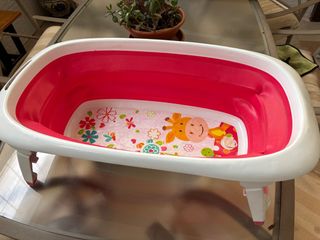 Práctica bañera plegable, ideal para llevar de viaje o usar en espacios reducidos. Su diseño permite un fácil almacenamiento. - Materiales resistentes y seguros. - Compacta y ligera. - Incluye tapón para el desagüe. Es fácil de montar y de usar para bañar al bebé en sitios donde sólo hay platos de ducha o es un lugar pequeño. Está usado solo 2 veces.