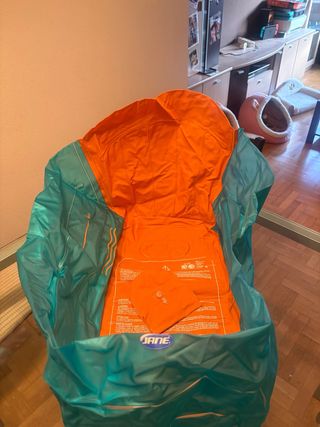 Práctica bañera de viaje de la marca Jane, ideal para llevar a todas partes. - Color naranja y turquesa. - Diseño plegable para fácil transporte.