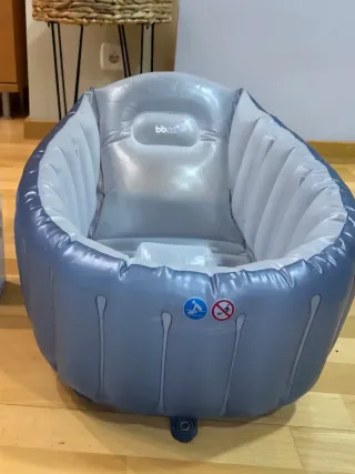 Bañera inflable de color azul, diseñada para la comodidad de los más pequeños. - Material resistente. - Base acolchada para mayor confort del bebé. - Fácil de inflar y desinflar. - Ideal para viajes porque no ocupa espacio Está nueva la compré para un viaje