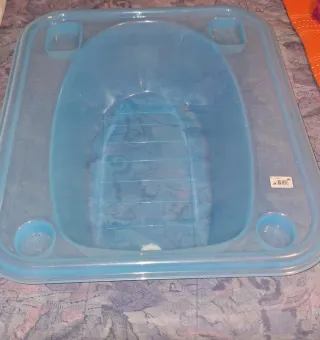 Bañera de plástico para bebés en color azul. - Diseño ergonómico. - Material resistente y fácil de limpiar. Sin Apenas uso